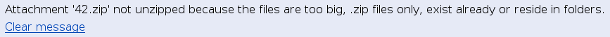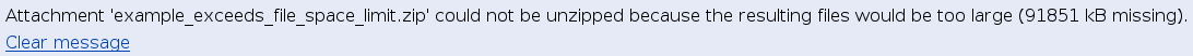 Si la taille totale des fichiers décompressés dépasse l'espace maximal alloué aux pièces jointes, le message d'avertissement suivant sera affiché :